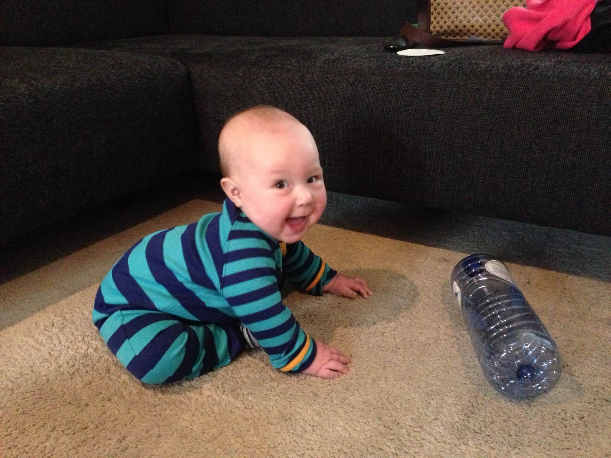 En toen had ik twee seconden niet gekeken, en lag jij plots aan mijn voeten. Je was helemaal tot in de keuken gekropen. Nu, dat is allemaal niet ver, maar toch wel een mijlpaal. Sinds die dag is ons leven namelijk veranderd, en dat van jou. Wij moeten nog leren dat we nu echt alles voor jou moeten verstoppen, omhoog zetten of afsluiten. Jij ontdekt de wereld. En man, wat is dat geweldig.