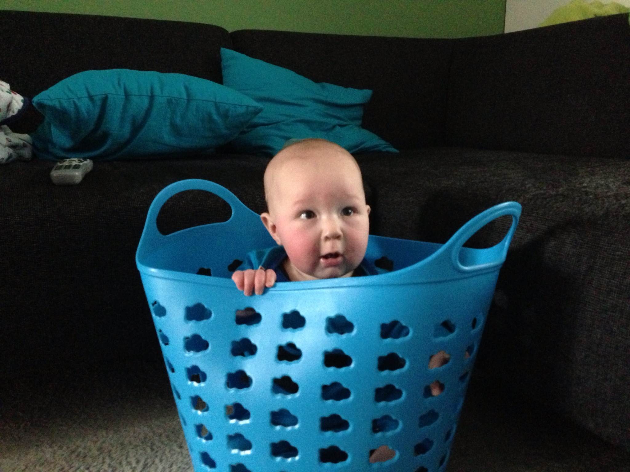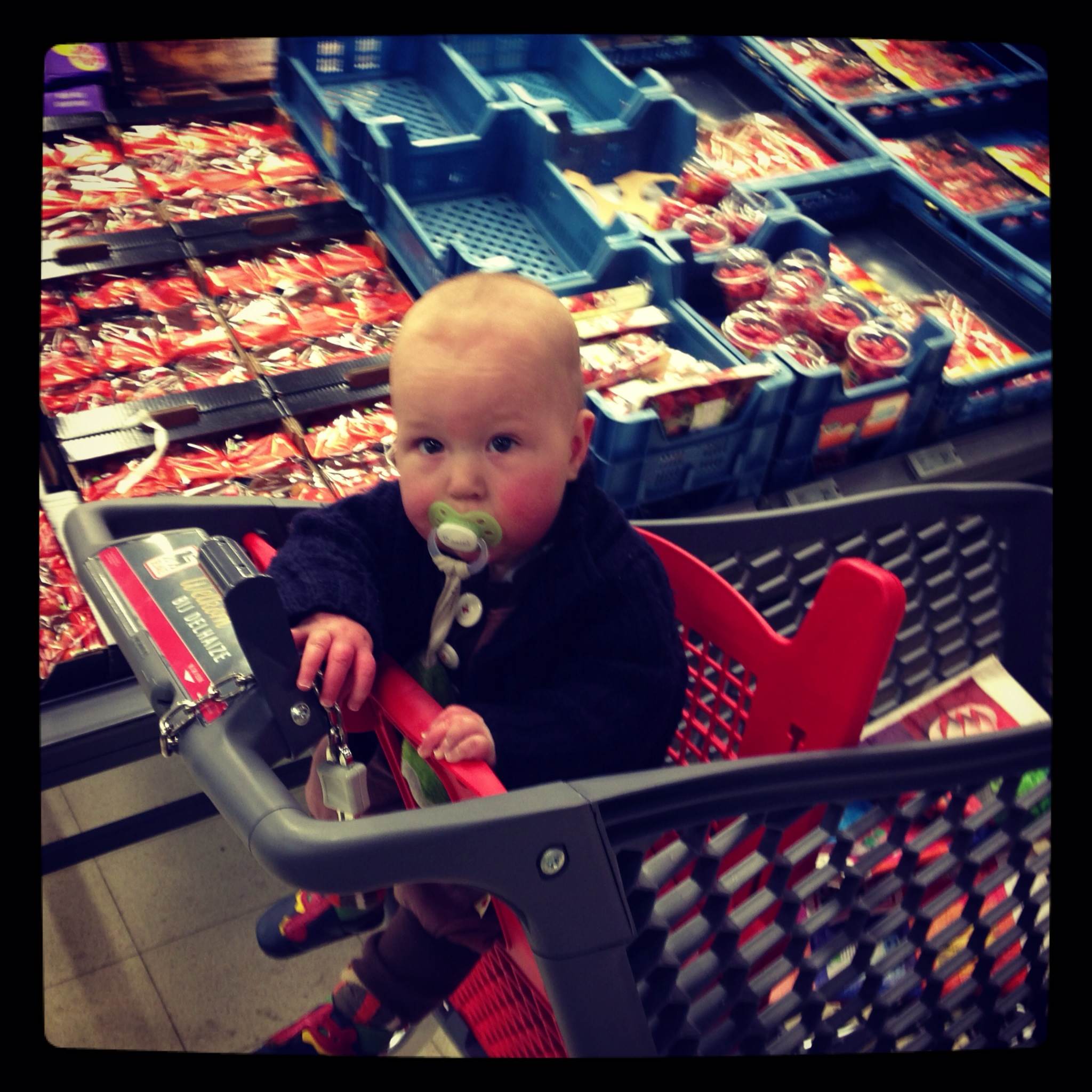 En tof dat hij in het winkelkarreke kan zitten, maar serieus, te zwaar is dat toch niet in de draagdoek? Ik durf zelfs Fien daar nog in steken, als ze te veel mekkert, en die weegt toch nog een paar kilo’s meer… Run Basiel, run! (allee, crawl)